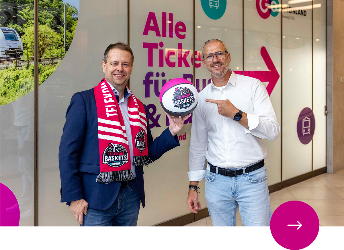 | go.Rheinland wird Partner der Telekom Baskets Bonn go.Rheinland und die Telekom Baskets Bonn starten gemeinsam in die neue Basketball-Saison. Die Kooperation mit dem Bundesliga-Club, die zunächst bis 2027 geschlossen wurde, setzt ein starkes Zeichen: Sport und Mobilität gehören zusammen. Ziel ist es, die Vorteile des Nahverkehrs noch stärker sichtbar zu machen und die Menschen in Bonn und der Region für klimafreundliche Mobilität zu gewinnen. Mehr... |