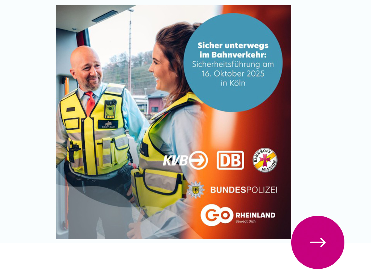 | Sicher unterwegs im Bahnverkehr Wer mögliche Gefahren früh erkennt und weiß, wie man richtig reagiert, schützt nicht nur sich selbst, sondern auch andere Fahrgäste. Darum zeigen Expert*innen der Bundespolizei, der DB InfraGO, der DB Sicherheit, der Kölner Verkehrs-Betriebe AG (KVB) sowie der Bahnhofsmission am 16. Oktober 2025 von 10 bis 13 Uhr im Rahmen einer Sicherheitsführung, wie man sich in Bahnhöfen, Stationen und Bahnen sicher bewegt, wo im Notfall Hilfe zu finden ist und welche Möglichkeiten es gibt, schnell Unterstützung zu rufen. Die Führung vermittelt praxisnahes Wissen und bietet die Gelegenheit, persönliche Fragen direkt an Fachleute zu stellen. Die Teilnahme ist kostenlos. Plätze können hier ergattert werden: Mehr… |