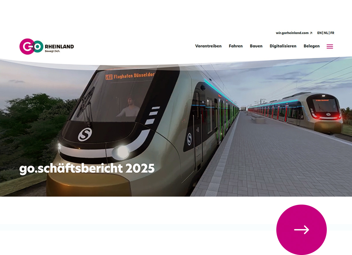 | Themen, Daten, Projekte: go.schäftsbericht 2025 ist online In ihrem digitalen Geschäftsbericht informieren der Aachener Verkehrsverbund (AVV), der Verkehrsverbund Rhein-Sieg (VRS) und go.Rheinland gemeinsam zu aktuellen Themen und Projekten. Die Ausgabe 2025 ist seit Kurzem online und bietet Information etwa zur Tarifreform im Jahr 2026, zur Naveo-App oder zu den neuen S-Bahn-Fahrzeugen für das Rheinland. Mehr… |